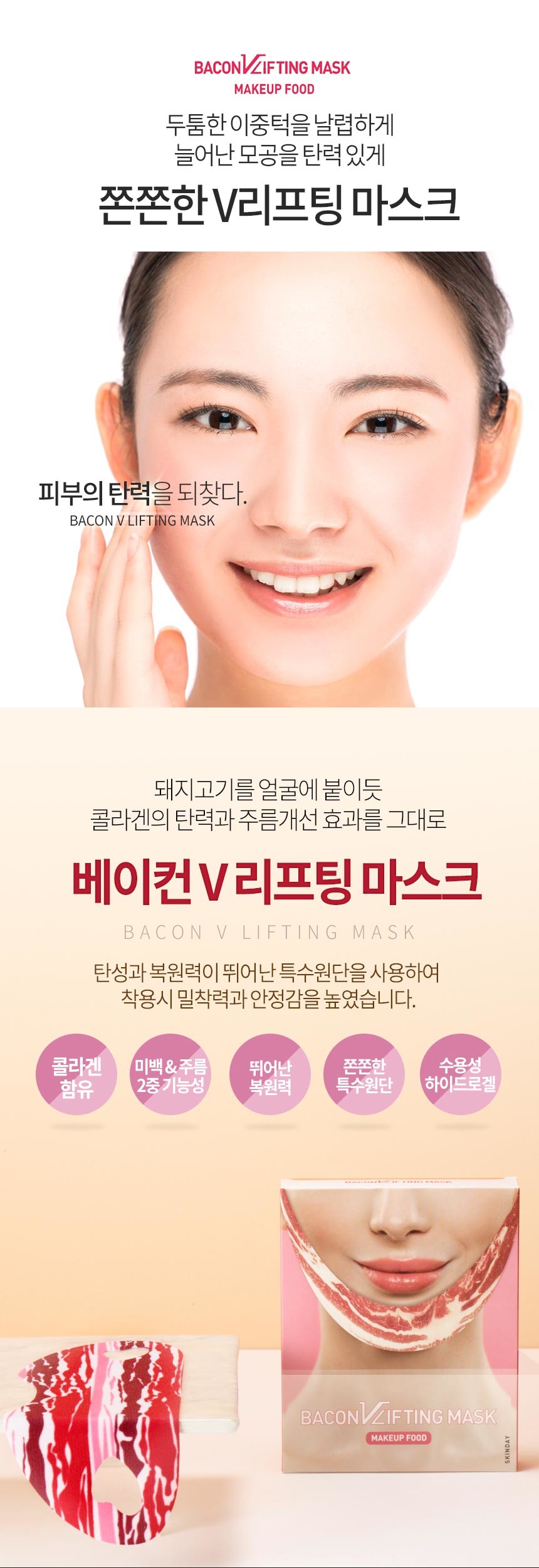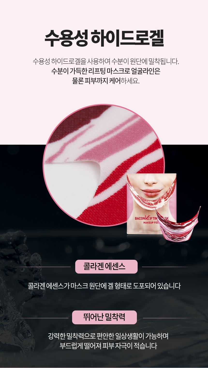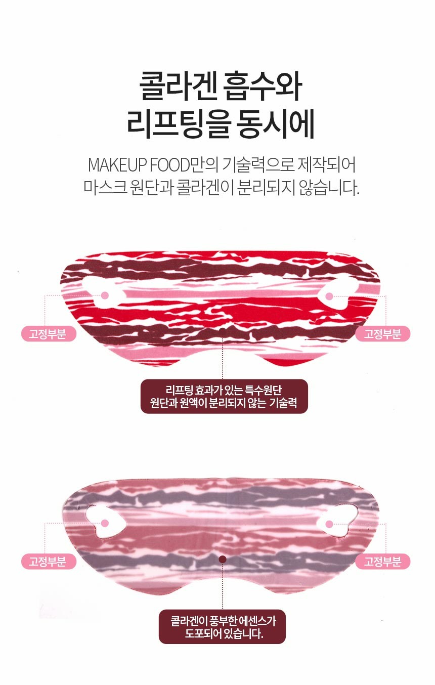 메이크업푸드만의 하이드로겔 마스크가 얼굴라인 뿐만 아니라 피부를 케어해주며, 콜라겐이 풍부한 베이컨 모양으로 재밌고 가볍게 쓸 수 있는 리프팅 팩입니다.