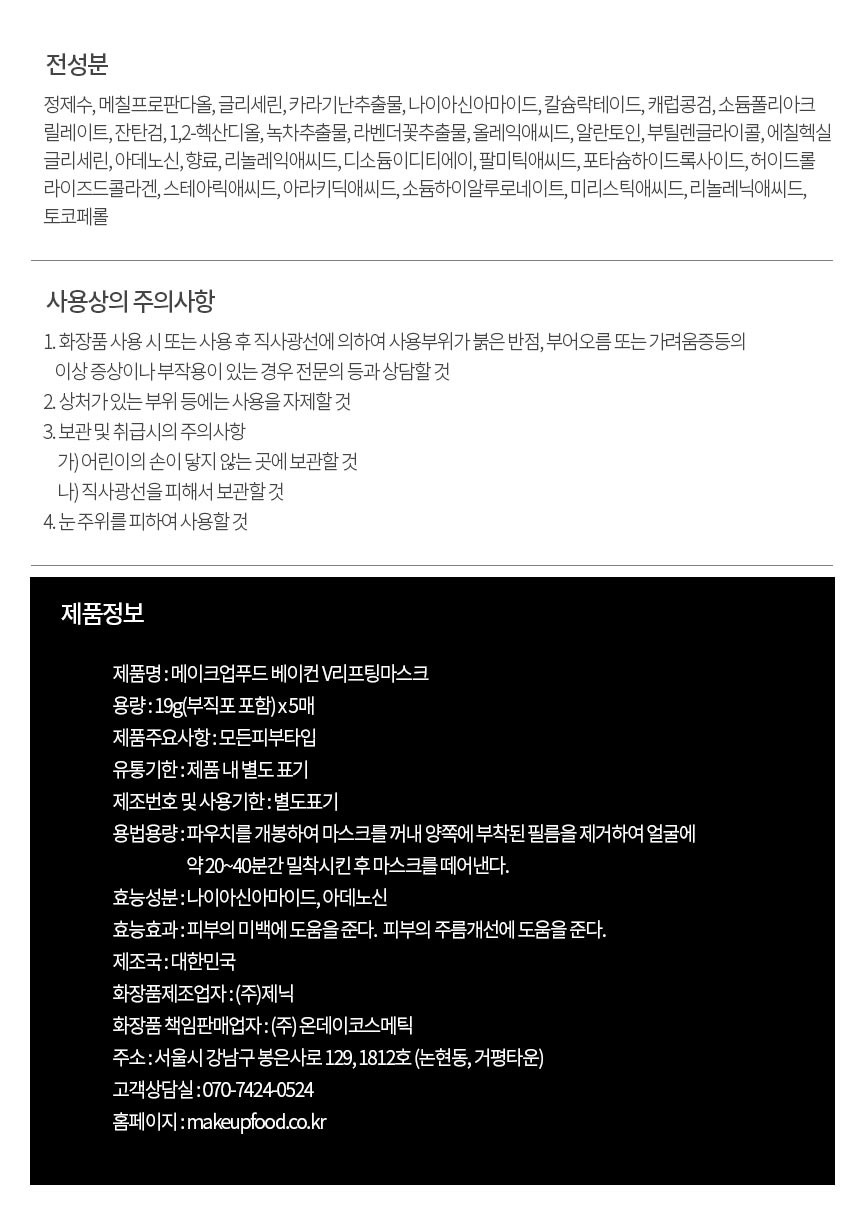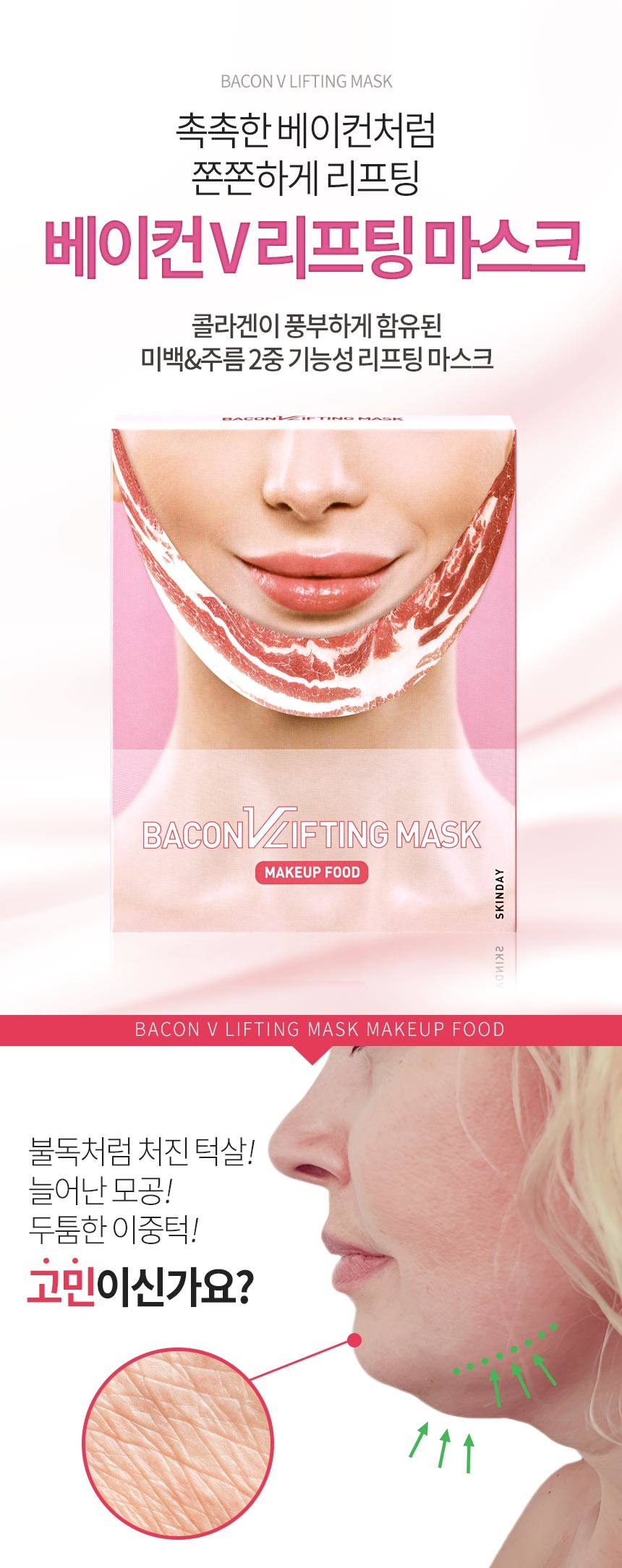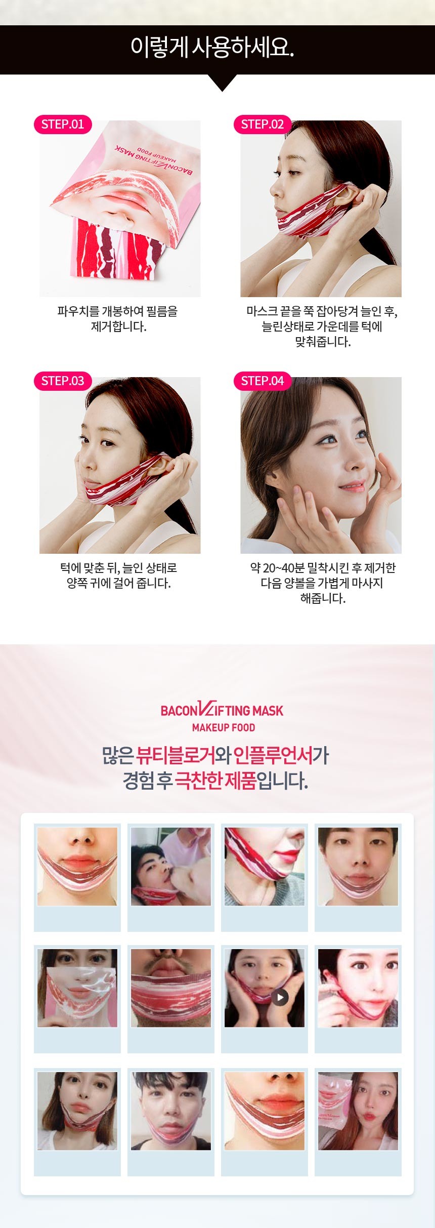 메이크업푸드만의 하이드로겔 마스크가 얼굴라인 뿐만 아니라 피부를 케어해주며, 콜라겐이 풍부한 베이컨 모양으로 재밌고 가볍게 쓸 수 있는 리프팅 팩입니다.